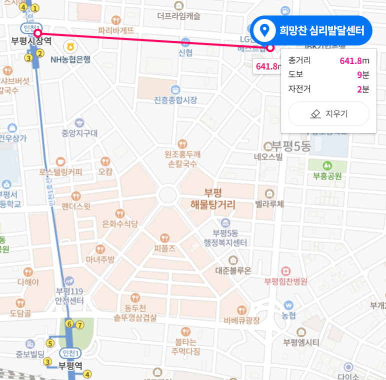 부평시장역 2번 출구에서 부평시장쪽으로 10분 정도 걸어오시면 부흥오거리가 나오며 덕천프라자 5층입니다.