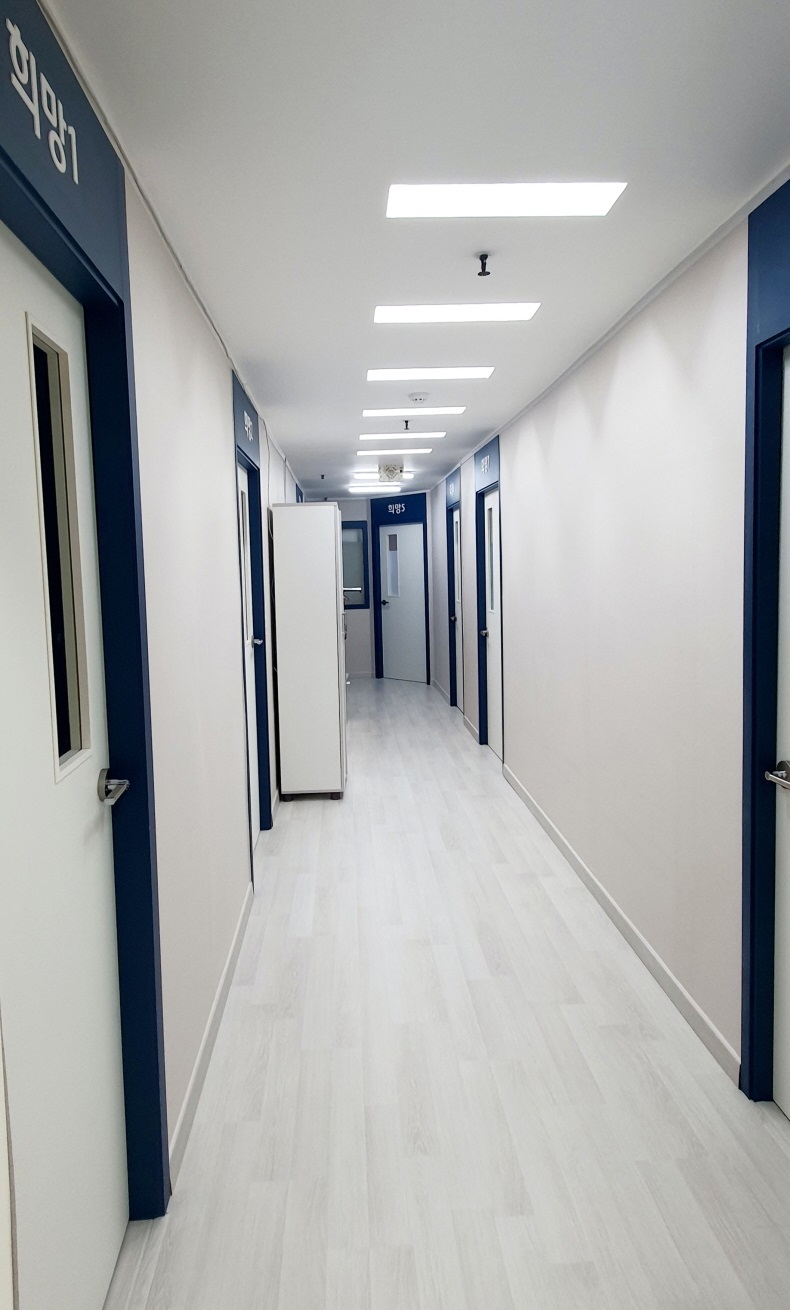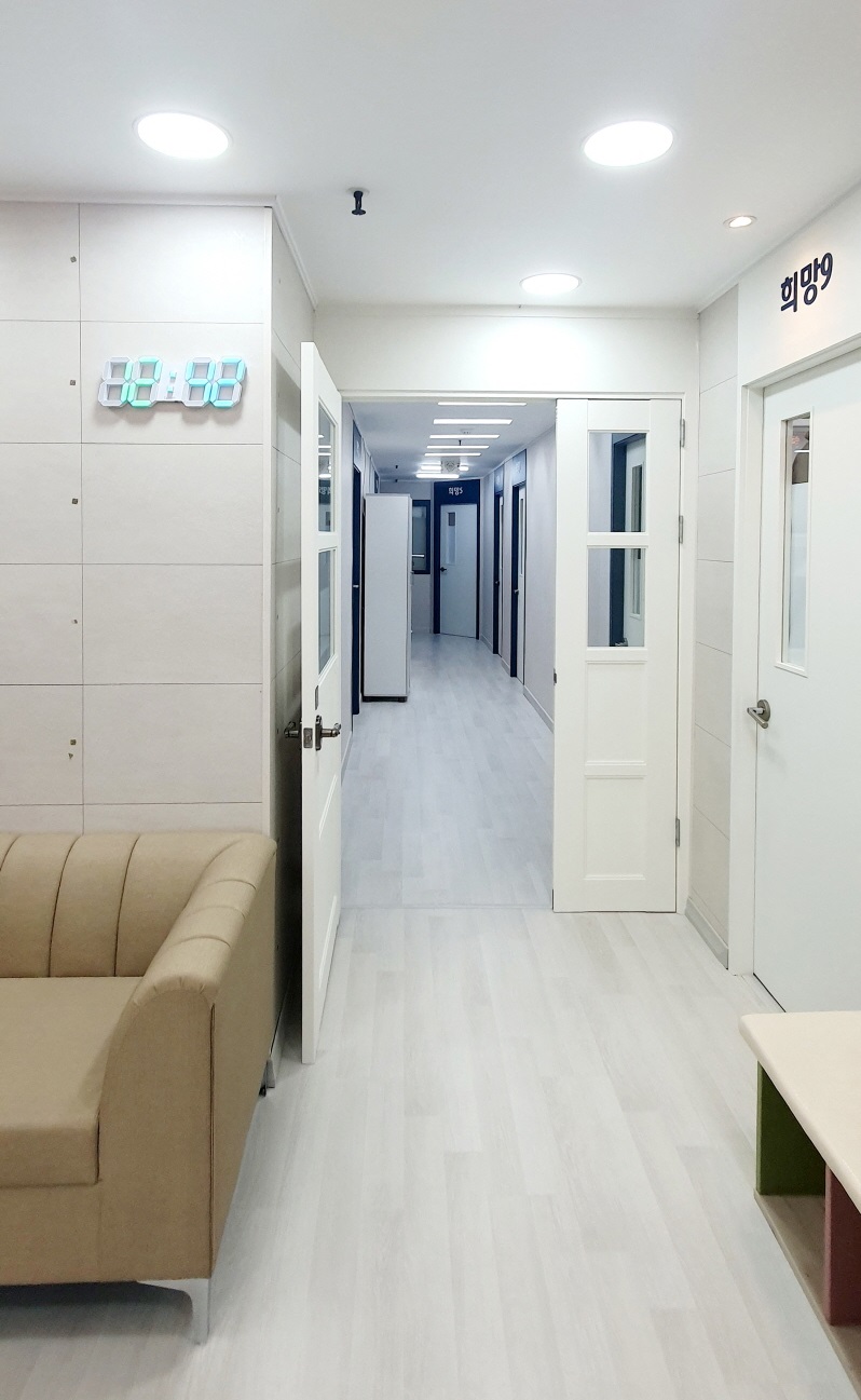 희망찬은 5층에 아동치료를 위한 총 9개의 치료실과 1개의 행정실을 운영하고 있으며 6층에 별도의 심리검사와 상담을 위한 상담실4곳과 세미나실을 운영하고 있습니다.